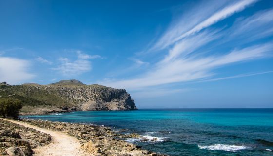 Beach with blue sky on Mallorca’s Llevant peninsula no people,photography,horizontal,nature,blue,vacations,outdoors,water,relaxation,clear sky,travel destinations,beach,sand,sunny,spain,idyllic,turquoise colored,majorca,mediterranean sea,hiking